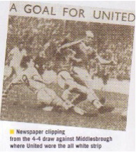 It has been documented that Leeds played in an all-white strip on the 17th September 1960 for a game vs Middlesborough[1] (We’ll return to a Middlesborough connection later). Jack Taylor was the manager and in fact this game was to mark the beginning of the end for Revie as a player.
