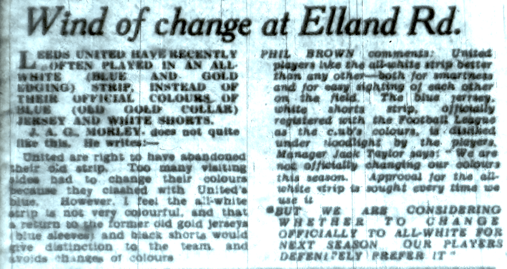 The fact is that Revie sensationally dropped himself on the eve of the game where the all-white strip seems to appear as a first team kit for the first time, claiming his self-confidence had gone. Based on some letters found in the YEP sports mailbag on the Thursday of that week, I’m not surprised. What is also extremely interesting is that in this mailbag there was a call from a fan to move to the all-white strip. It was clearly being discussed across the fan base at the time.