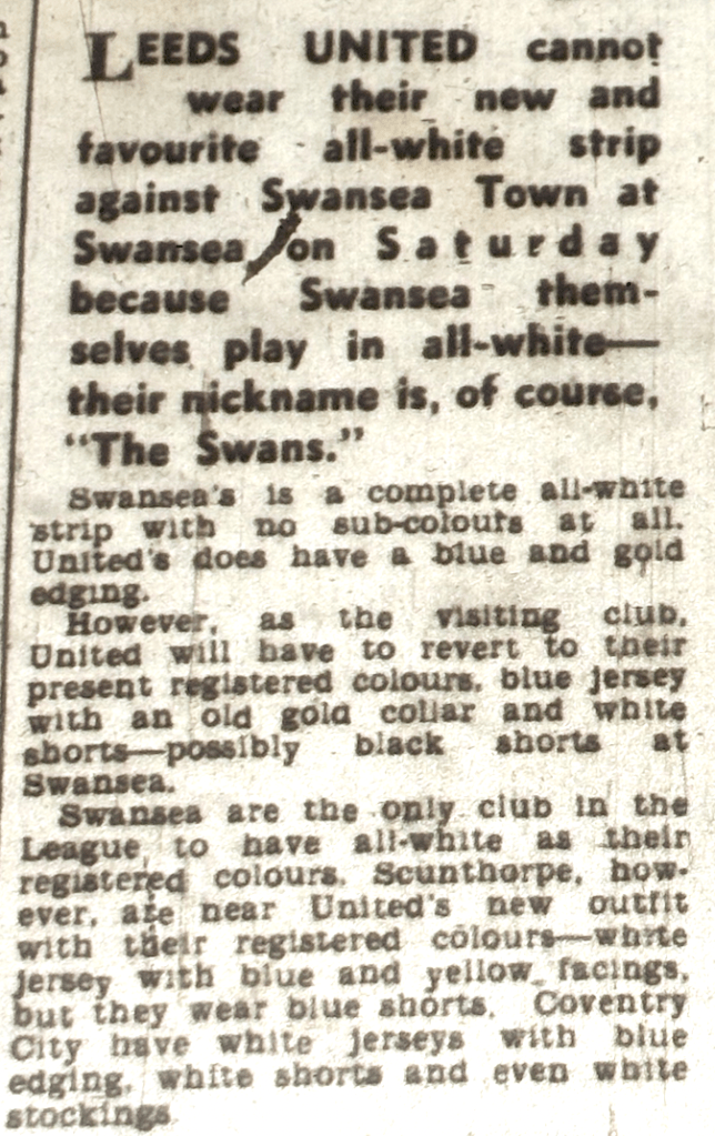 Leeds continued with the white strip when they could that season but had not officially registered their all-white strip at the start of the season and when kit clashes with clubs like Swansea came up, they had to revert to blue and gold as this YEP article from Tuesday 17th November 1960 mentions. However, it’s clear that the decision to change to all white had been made well before Don Revie was manager.