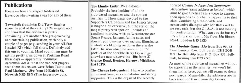 By June/July 1987 issue 8 of WSC was listing a publications column, fanzines and how to get all 4 of them. This lasted until May 2000 when over 400 were listed over 2 pages of small tightly packed text before a recently introduced column “Football on the web” took over (it didn’t last!). A fantastic resource but wading through all the digital back copies for months still leaves gaps. Some fanzines had been and gone before WSC started listings and people had to let them know they were publishing, something that didn’t always happen.