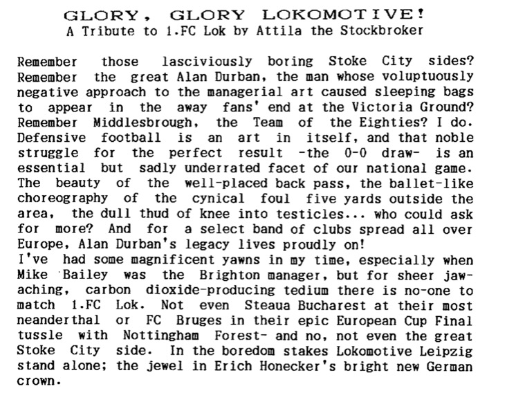 Atilla the StockBroker, punk poet and multi instrumentalist had articles published in Eagle Eye, Crystal Palace zine and also….Und Nun Voll dampf, (and now full steam) an English language fanzine dedicated to Lokomotiv Leipzig, the East German “works” team that have evolved into the very non punk Red Bull Leipzig. A spoof one off fanzine produced by the people behind the City Gent, amongst its stated aims were the “re-education of trainspotters and vegetarians.”
