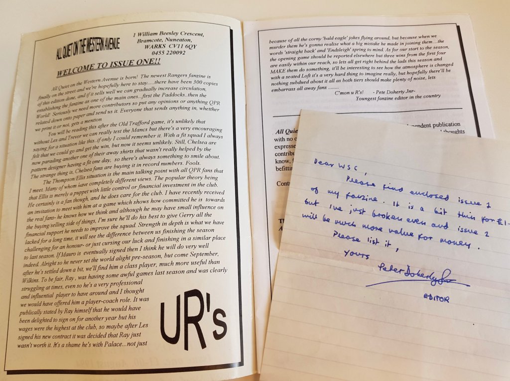 In previous blogs on fanzines, music and the media today (https://footballfanzineculture.blog/2025/05/22/football-fanzines-and-the-media-today/ and https://footballfanzineculture.blog/2025/06/26/the-list-playlist-side-3/ ) we mentioned that a QPR fanzine All Quiet on the Western Avenue (AQOTWA) was written by a certain Pete Doherty Jnr.