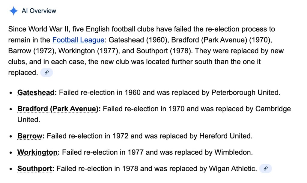 Compare this to the AI result of a search for clubs not re-elected in English football post World war 2. It is just plain wrong, it mentions 5 when there were 7 (OK Stanley folded anyway but they still had to officially be replaced ) AI can’t even get the basics right here but worse still is that it’s vague and just a list scraped from a few websites before it couldn’t be bothered to go on.