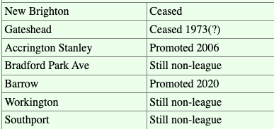 There is also surprisingly little in further google searches giving a succinct summary of the clubs lost to re-election. There wiki[4] is good but it’s not easy to extract detailed info from this. There’s one weighty tome from De Montfort university[5] that is VERY comprehensive, probably too comprehensive plus some reddit/forum entries (AVOID AVOID AVOID!!!) but that’s about it There was a non secure site listing ALL of the teams that were re-elected in a table that would have looked great in a fanzine but lacks the production values we’ve come to expect today but in any case it disappeared from the web….