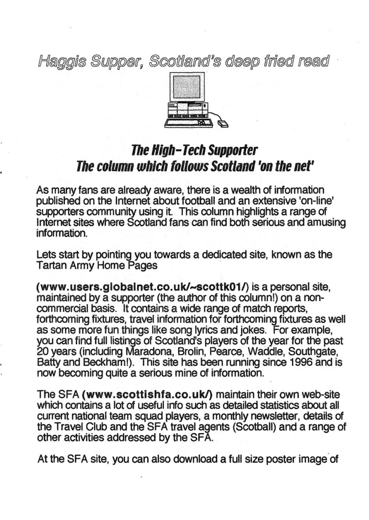 As fanzines struggled with the rise of Cyberdyne systems and Skynet they began to list websites that were useful or in the spirit of fanzines. Issue 1 of Haggis Supper, a fanzine supporting the Scottish national side carried 3 pages listing some fantastic sounding websites.