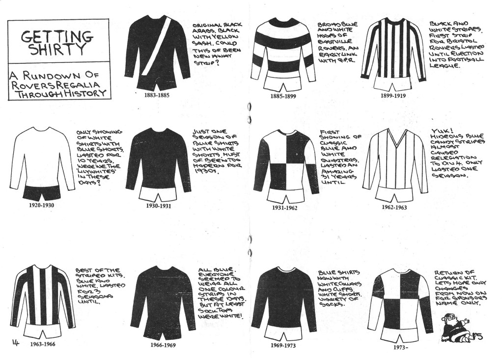 This week I discovered this nice little centrefold piece in the Bristol Rovers fanzine The Trumpton Times issue 1 in December 1992. Even in black and white it’s great, clear, concise and the handwritten notes next to the lovely, neat drawings (look at the collar on the 1931 to 1962 quarter kit!) just add to the quality and feel of something done with care, including Santa in the corner. Plus, they call kits regalia, I’m all for the use of words like regalia. Simple, concise and yet detailed, even the lack of colour isn’t a problem as your brain fills the colours in from the descriptions and your vague memories of Match of the Day.