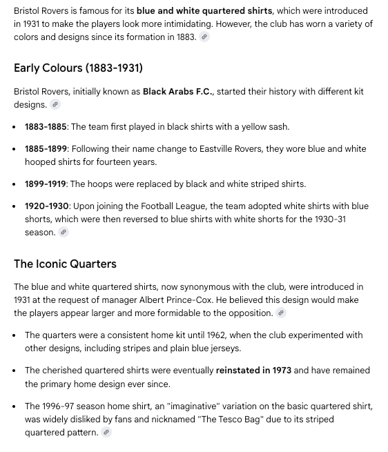 It’s great but isn’t this the sort of thing that the internet does better? Well, Google AI presents you with a list and adds a summary of key points before going into the minutiae of kits makers and sponsors. It’s OK I suppose but not really something lavished with care or very eye-catching.
