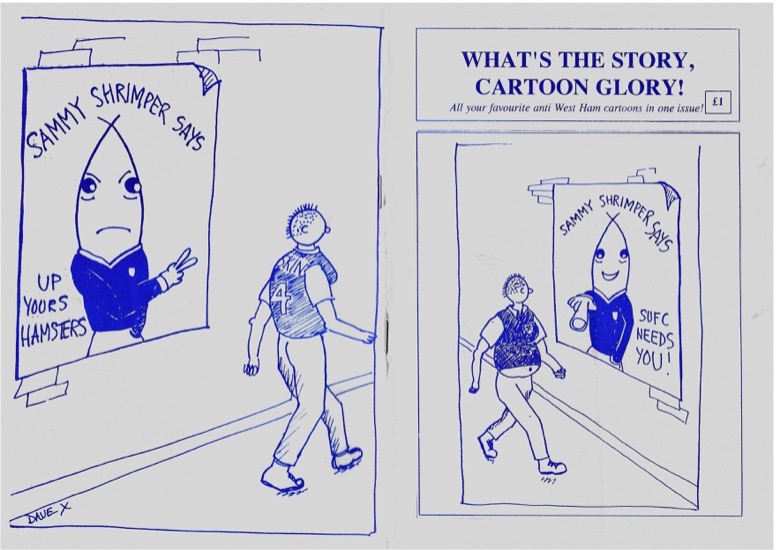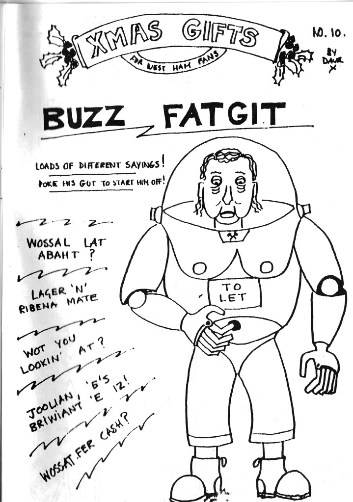 There were many spin off one offs, cup final specials of course, but also things like What’s the Story Cartoon Glory, a one off spin off issue of Southend’s What’s the Story Southend Glory. Editor Dave Knight explains that it’s all a bit of fun and they’re raising money for charity but the front / back cover double whammy and Buzz Fatgit Christmas gift set the tone in spectacular fashion. Lovely jubbly!