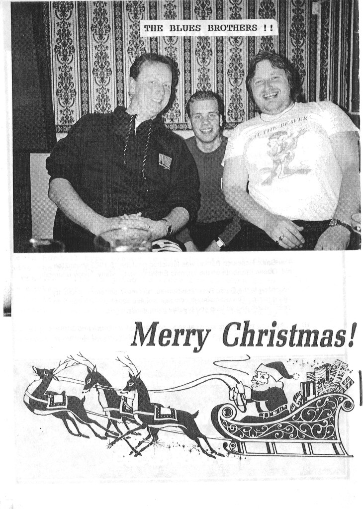 The editorial team for Billericay Town’s Cowshed Blues went stark staring crazy with their Christmas “decoration” in their 1992 festive issue by issuing a picture of the editorial team. This is an exceptional photo in many ways, an absolute fanzine classic. Despite the lack of colour the wallpaper really pops and the staging..well you can only assume that the chap in the middle wanted to look like a 12-year-old sandwiched between his older and rather solid looking uncles. All of this paired with Santa and his sleigh, well it’s ‘chef’s kiss’