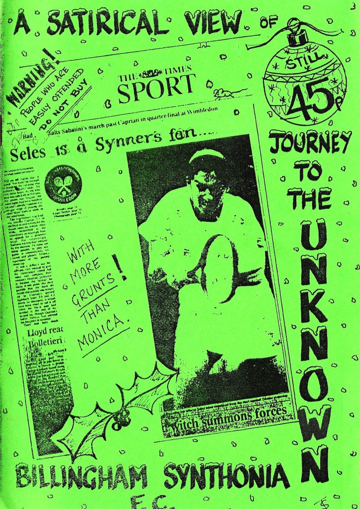Billingham Synthonia fanzine (ICI, fertiliser, look at my post on twitter) Journey to the Unknown from December 1992 did this with aplomb. The covers contain not only a Christmas celeb endorsement but snowflakes and a bauble along with the “Don’t buy if you’re easily offended” warning. Festive!