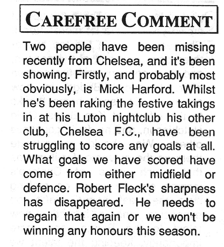 Let’s subvert the form a little now by having a look at what the Christmas fixtures might do for a fanzine’s mood. Chelsea’s Carefree issue 6 appeared in January 1993. The editor is not in a great frame of mind after Chelsea drew every game in December scoring just 2 goals (it would be March before they won again!) but he knows who to blame.