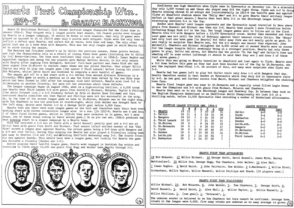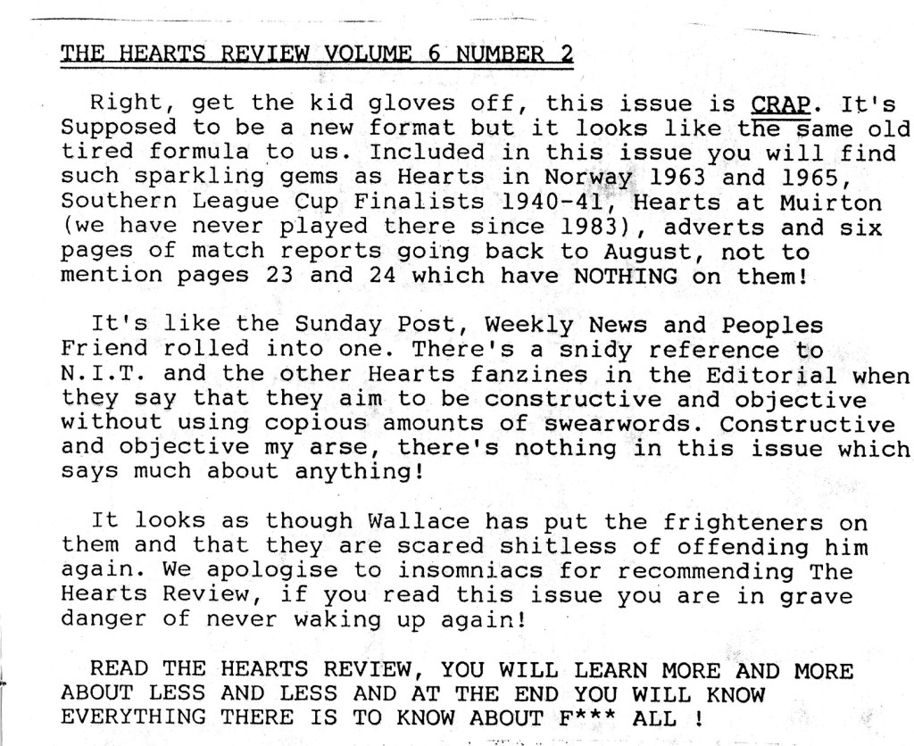 The Review was always focussed on the history of Hearts and for sure was more genteel than some felt a fanzine should be. However, it was always a very well researched and impeccably laid out so to call it crap is a bit harsh. I beg to differ anyway, who wouldn’t want to read about Hearts first championship win in this article that appeared in HR..