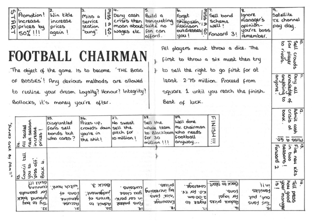 We mentioned at the beginning that quite often fanzines were too busy berating their favourite chairman and so finally we’ll travel to Leeds. Let’s face it, no Christmas would be complete without a board game to fall out with family and friends about. Leeds’ Hanging Sheep “Crimbo 93” issue 28 promised an Xmas board game and boy did they not live up to that promise.