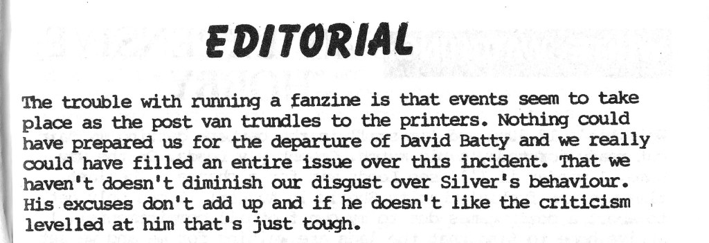 Issue 20 did also include a cartoon (Black and white, poorly trimmed, a fanzine classic) Christmas card/insert for all readers. I have no idea what event it is parodying but we’ll revert to the seasonal favourite, “It’s the thought that counts”. If anyone can work this out, please get in touch.