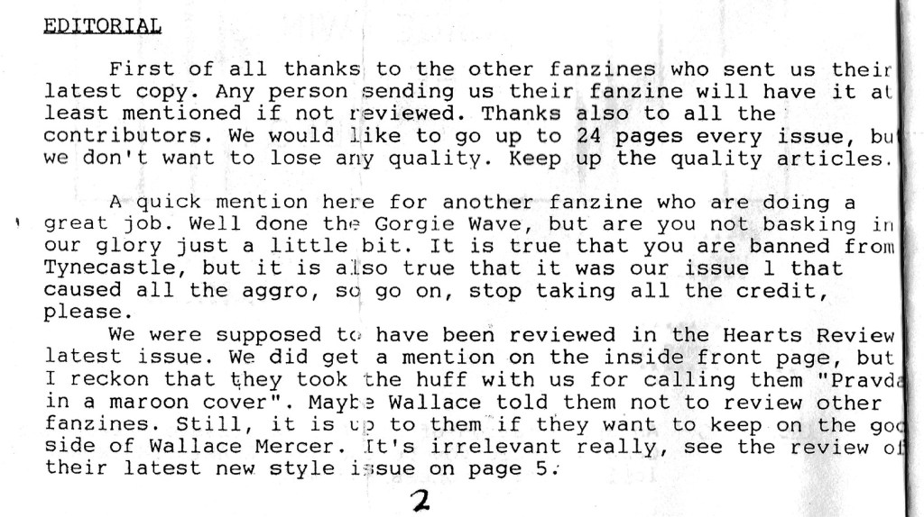Apparently though there isn’t room in Edinburgh for everyone (There were 25 Hearts 25 fanzines alone over the years!) So our heroes spend lots of time slagging off other Hearts’ fanzines. They are upset not that fanzines are banned from Tynecastle but that they aren’t getting credit for prompting the ban. This started a lengthy tit for tat slanging match with Gorgie Wave played out by printed correspondence on the pages of the fanzines. Fanzines really were the first Social Media.