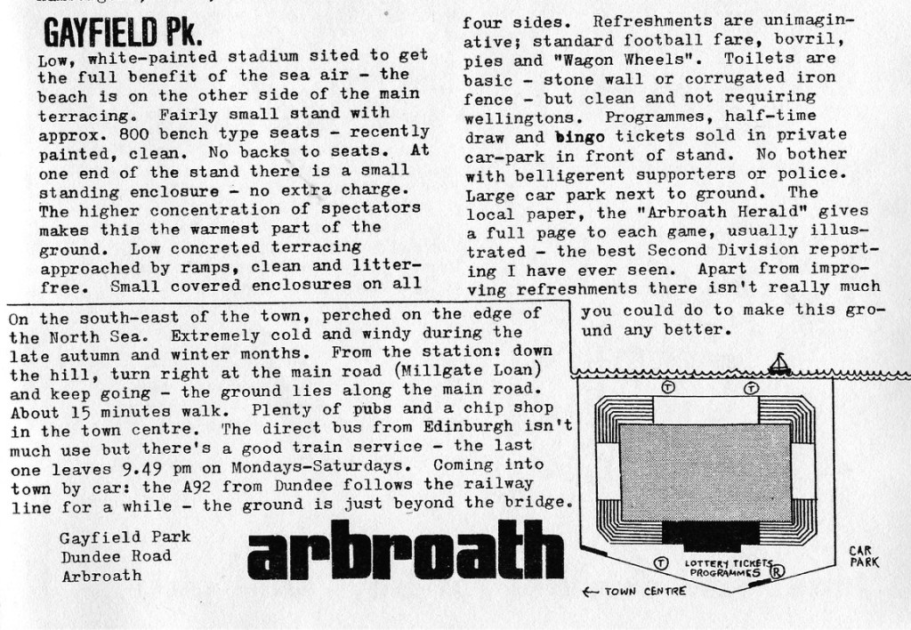 OK I know this blog is about cover art but I can’t help reproducing some more work by Alick inside the zine. His reviews of Scottish grounds are sensational and this one of Arbroath’s Gayfield Park, the ground closest to the sea in the UK contains a beautiful illustration plus the immortal line “The higher concentration of spectators makes this the warmest part of the ground”