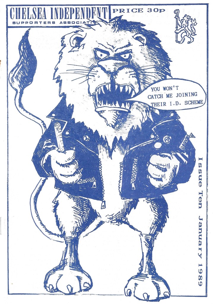 Moving across London this fantastic depiction of the Chelsea lion appeared on the cover of Chelsea Independent issue 10 in January 1989. It shows that even the club’s badge is against Thatcher’s stupid ID scheme. “Real” art commonly mocks political/royal figures and fanzines were no different in taking this approach.