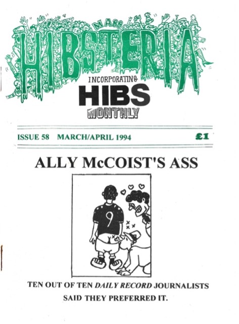 Let’s start with a simple, arresting example which tells a story.. Hibs Mass Hibsteria issue 58 from 1994 covered the Scottish press’ obsession with wee Ally..AND their header is an absolute favourite of mine, the club colours, the mass of fanzine buyers, the joy of support and the fish net stockings…