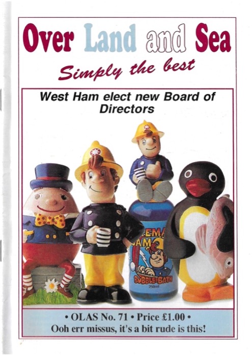 Protest was never far away on a cover, West Ham’s Over Land And Sea (OLAS) made their views of the new board of directors appointed by the club in 1994. The Issue 71 cover is very jolly but might also have landed the editors in trouble re copyright!