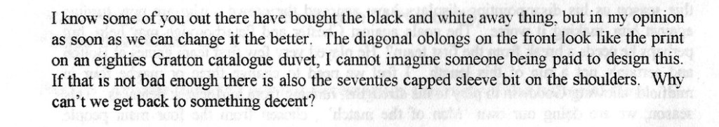 Plus, there is a complaint about the design (design is art, OK?) of the away shirt which looks like a “Gratton (sic) catalogue duvet and to be honest, I can understand why. The sponsor a reminder that local sponsorship is far better than some global corp or betting company. On the other hand it does recall a windswept, rain lashed Saturday morning buying some new keks from River Island and queuing in the car park at Parkgate <shudders>.