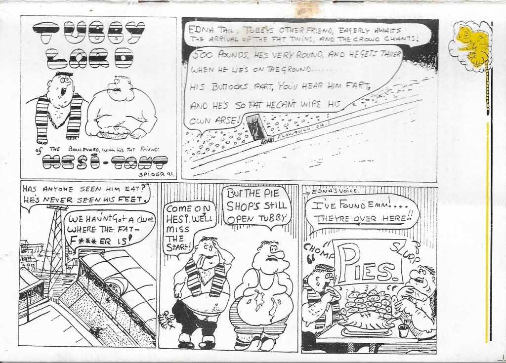 On the back cover we are treated to the delights of Tubby Lard and Hesi-tant, erstwhile Hull City and pie fans…simple, crude but effective, much like Hull’s football that season as they finished 12th but qualified for “promotion” to the Second Division as the Best League in the WorldTM Premier League lumbered into view.