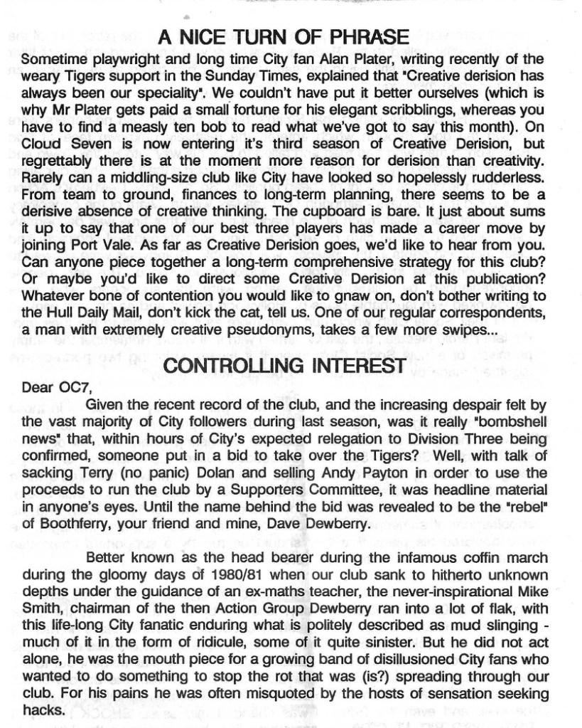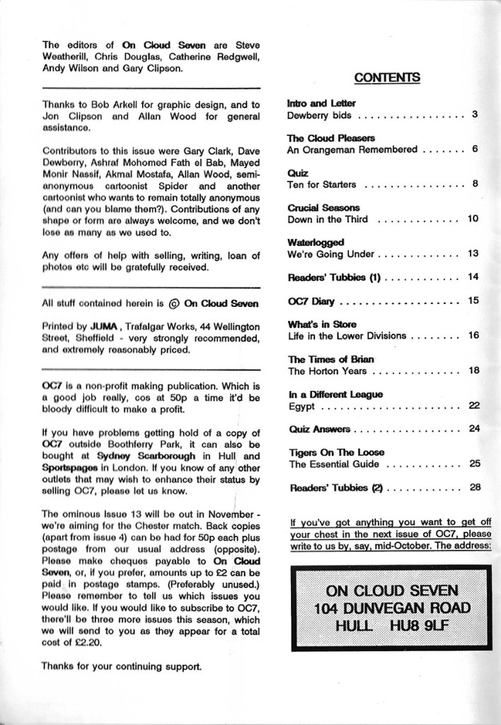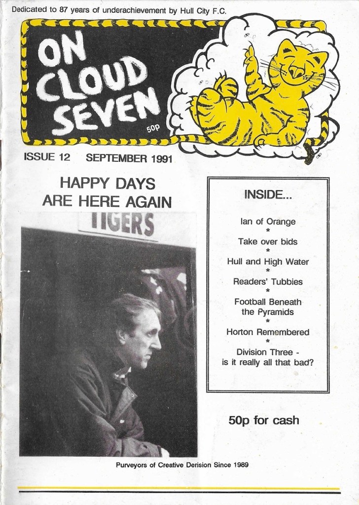 Today’s #FanzineoftheDay is issue 12 of On Cloud Seven a Hull fanzine from September 1991. Hull are newly relegated to the 3rd Division (League one) in their 88th season. The brilliant name stems from manager Colin Appleton’s idiomatic faux pas when asked by a journalist how he felt about returning to the Tigers.