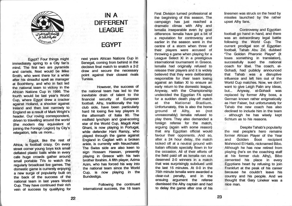 Equally as surreal there is 2 pages on Egyptian football. This is great fanzine fare, just when you least expect it BAM! 4 columns on the soap opera that is football in Egypt in 1991.