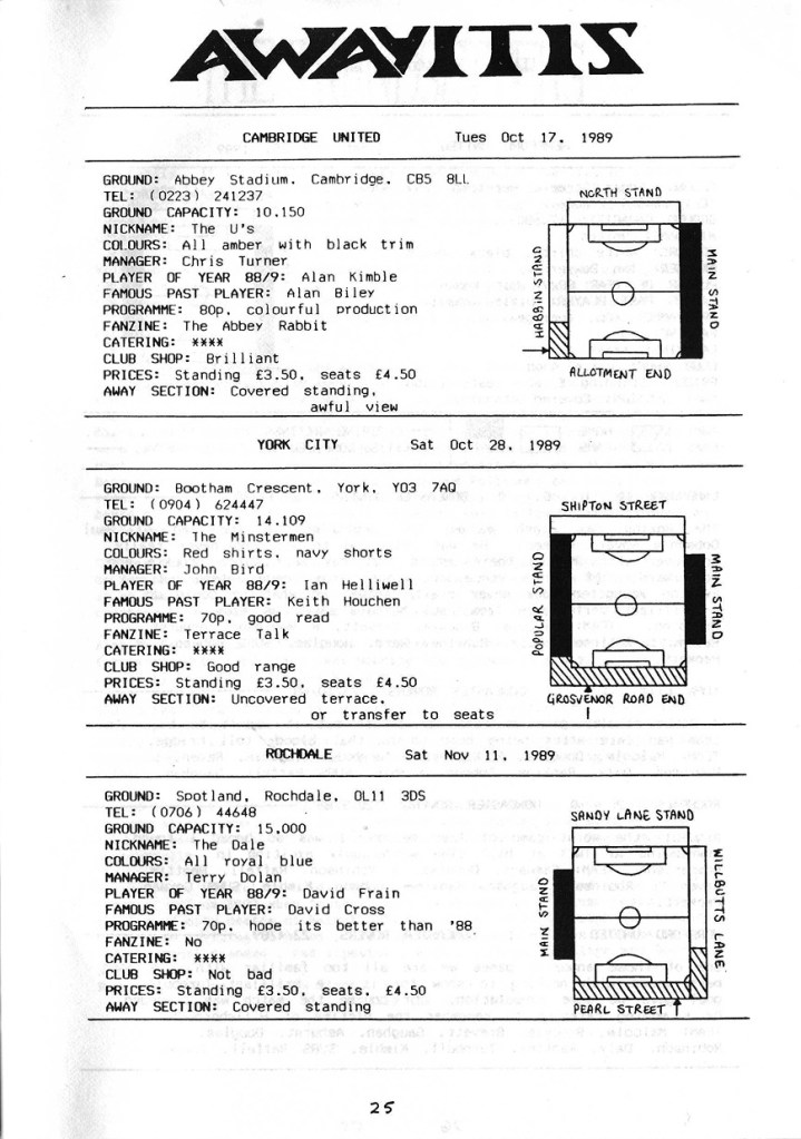 Awayitis from Doncaster’s Raise the Roof issue 2 in 1989 is a classic of the genre though and does include lovely hand drawn pictures of grounds, famous past players, programme AND club shop reviews and much much more though they do seem to have avoided catering on past visits. Brilliant.
