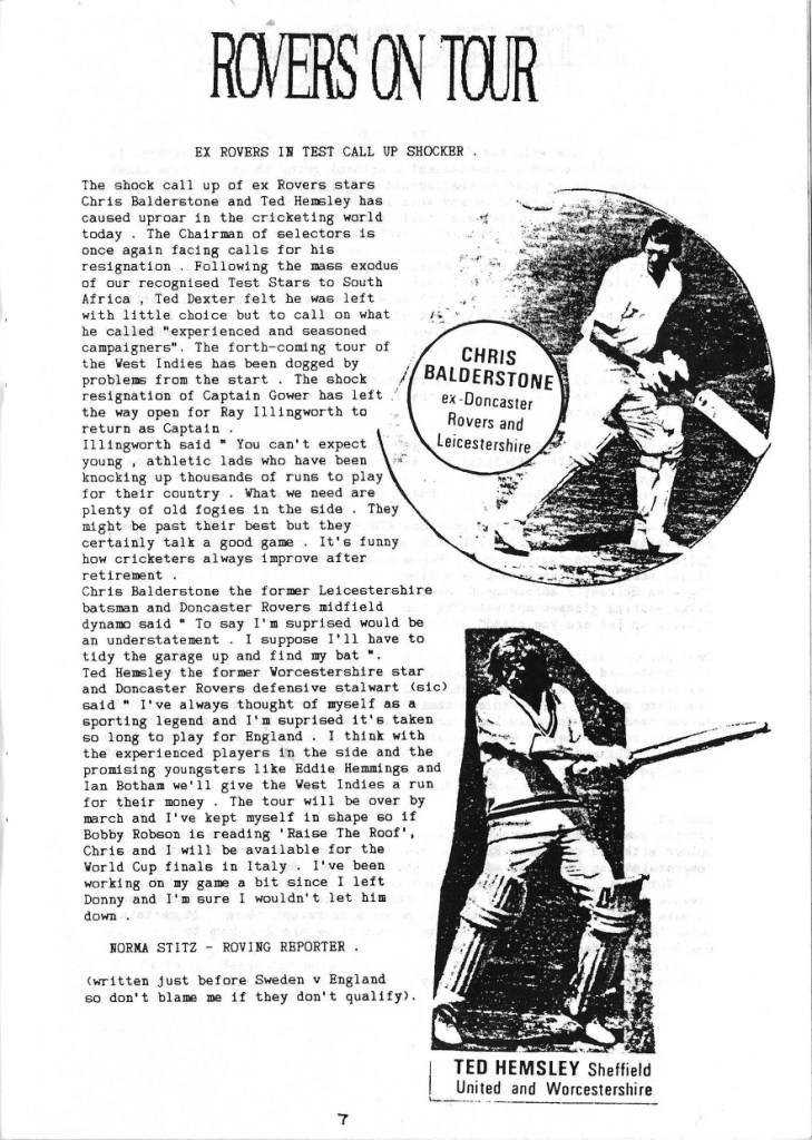 Spoof humour or sports cross overs were never far away. Also in Raise The Roof 2 is a report that two former players “Midfield Dynamo” Chris Balderstone and Ted Hemmings might be going on tour, possibly called up to England’s forthcoming test tour to the West Indies with the rebel tour of South Africa having shorn Ted Dexter and the selectors of his stars.