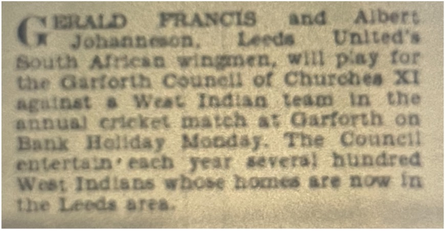 A reminder of the times players could play both sports, Compton, Goram, Close, Hammond, Sidebottom, Botham and Drake perhaps the most notable amongst many. Leeds’ Gerry Francis and Albert Johanneson turning out for the Garforth council of Churches a lesser-known appearance but it happened on the 1961 August bank holiday according to the Yorkshire Evening Post.