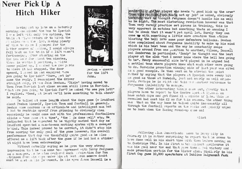 I’m still scratching my head as to whether this is a spoof or not, but it tells the tale of a Tractor Boy hitching it to Portman Road and being picked up by a white rover driven by non-other than striker John Deehan. He played for Ipswich between the summer of 1986 and 1988 and scored 11 in 49 for them so that’s when the action happened with this zine published around 1990.