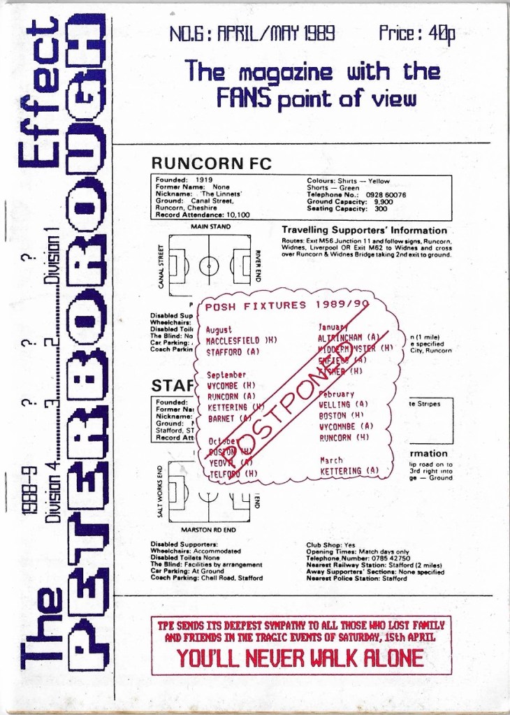 It might be something simple, Peterborough fanzine The Peterborough Effect celebrated avoiding relegation from the bottom tier in April 1989 with a cover showing cancelled travel plans to the likes of Runcorn and Stafford. I also like the scale showing potential route up the leagues. Creativity, relief and optimism, a heady mix.