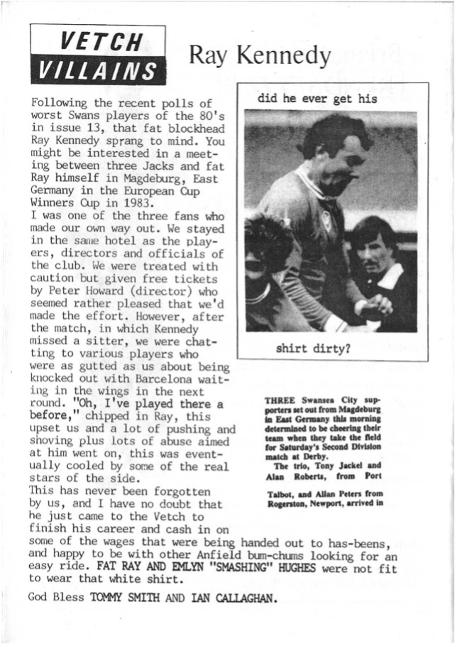 By the time Kennedy was at Swansea he seemed to be struggling for form as this article from Jackmail issue 14 from 1990 infers, it would later become clear that his Parkinson’s was already presenting itself. Our correspondents weren’t to know that however as events in a hotel bar in Magdeburg prove. Having made an incredible trip behind the Iron Curtain when that sort of thing was far from simple or safe they perhaps had a right to feel somewhat aggrieved when Ray showed a certain indifference to the Jacks losing 2-1 on aggregate to the Ossis with our travelling heroes thus missing out on a trip to the Nou Camp. “Pushing and shoving” ensued despite free tickets. Security would be involved nowadays if you could even get into the hotel of a top tier side on a European interlude.