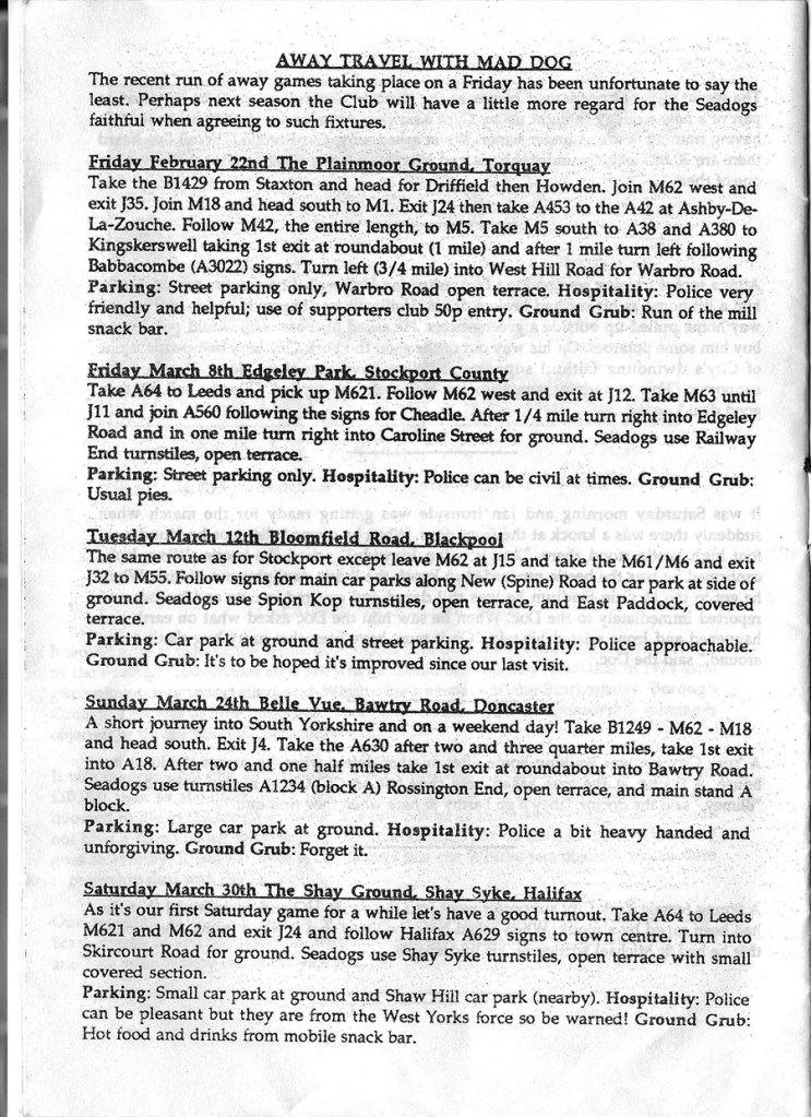 Sometimes fans couldn’t even be bothered with fancy “graphics”, take this beauty from the 1989 Scarborough Warning fanzine for example. Simple but effective, though mystifyingly the directions to Torquay don’t start in Scarborough but from 9 miles south in Staxton. Anyway, Mad Dog includes pie reviews and this would be easier to carry on the car seat next to you than an A-Z. Who needs Sat Nav?!