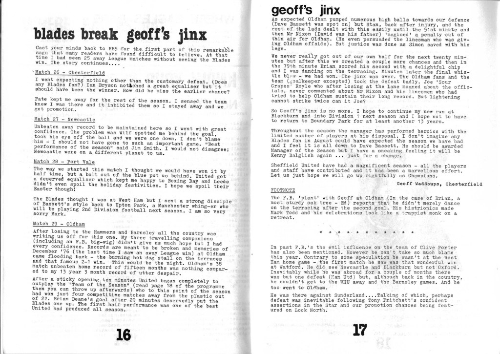 I can’t leave you hanging on, in Issue 12 from May 1990 it is revealed that GEOFF’s JINX IS OVER though not without further misery and another year passing but still, anyone would take a 2-0 away at Boundary Park ( 28th March 1990).