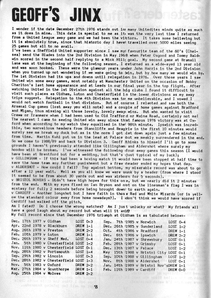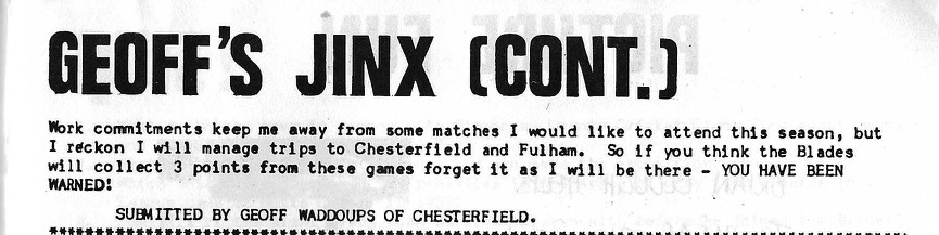 Few though will be able to beat Geoff’s incredible tale of woe recounted in issue 5 of Sheffield United fanzine Flashing Blade. In 1989 our hero Geoff recounts THIRTEEN YEARS of travels without a victory. It’s also a great little piece outlining long forgotten matches and including a list he had bitterly compiled to document his travails.
