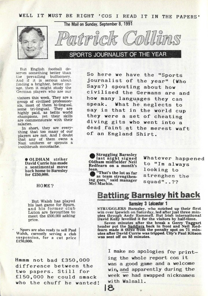 Today’s fanzine of the day is South Riding issue 12 all the way from Barnsley in September 1991 with our heroes contemplating their 11th successive unsuccessful season in Division 2 (championship). I looked it up and to give you an idea their top scorer this year would be Andy Rammell with…8 goals. Oh dear, crowds would not be flocking to Oakwell.
