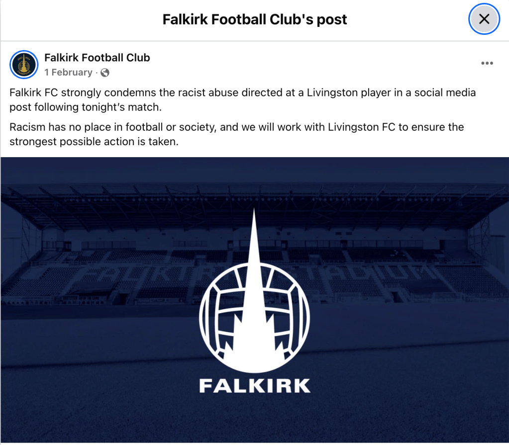 [3] https://www.falkirkfc.co.uk/2025/02/07/supporter-update-racist-abuse/?fbclid=IwY2xjawJQ3kNleHRuA2FlbQIxMAABHcWAH1wZJ26JcsGRz9Ahq9c0qJ1qnxwqMp68rRQHHFpJu9-thbaVrwv5Og_aem_9D6V0SHHdxg-TUPasxX1cg