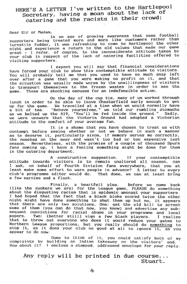 An almost perfect example of this is a letter which appeared in Chesterfield fanzine The Crooked Spireite in September 1990. Written by editor Stuart Basson it perfectly demonstrates the humour and protest that we saw in fanzines, covering not just the appalling state of stadiums and the shocking catering ‘options’ so common at the time but also absolutely nails the disgraceful acceptance of racism by large parts of football and society in general. I’m pretty sure he didn’t receive a reply.