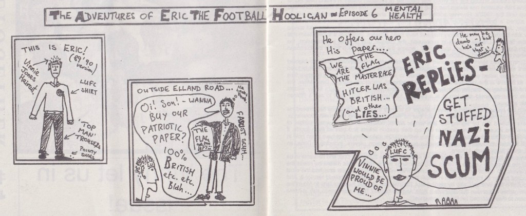 The fanzine didn’t flinch in its coverage of the National Front racists outside Elland road, running a photo of them on the cover of issue 3, challenging them with peaceful protest outside the ground, plus running sarcastic articles and cartoon features.