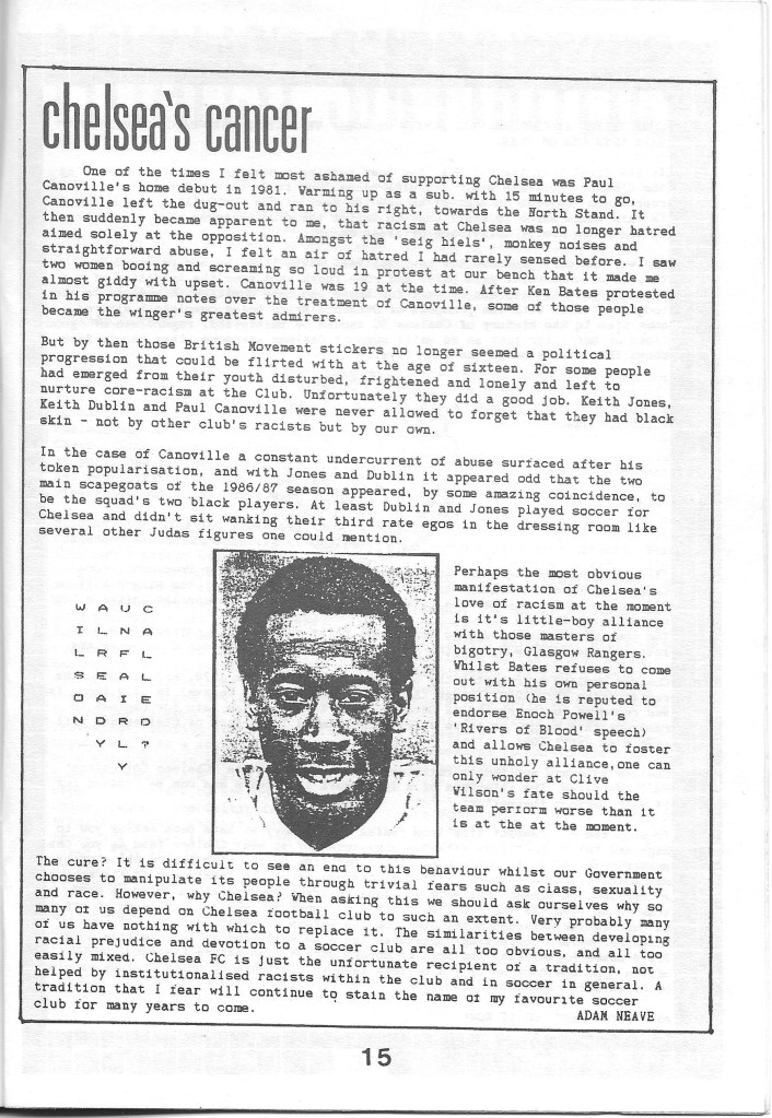 Chelsea were a club plagued by many issues in the late 80s, The Chelsea Independent fanzine was set up to fight a proposed merger with QPR and Fulham but was also very prominent in the fight against racism.
