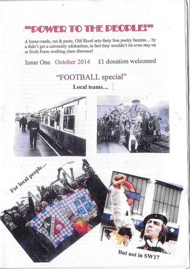 Humour and rage were both used as instruments of protest, and so was poetry. In October 2014 a fanzine with a TV reference appeared, a football special issue of an “Old Skool arty-farty free poetry fanzine” Power to the People. The choice of title was tongue in cheek, stolen from Wolfie, more associated with Dulwich’s arch-rivals home Tooting and Mitcham. All the pieces were protest themed against some form of discrimination or gentrification in modern football with racism obviously in the front of minds.