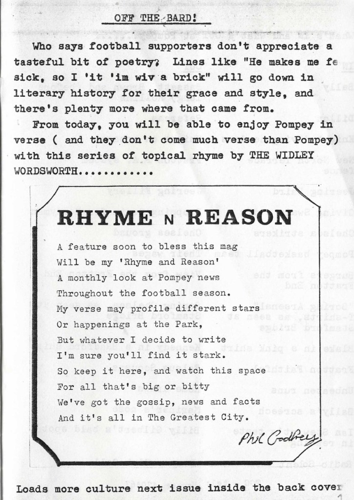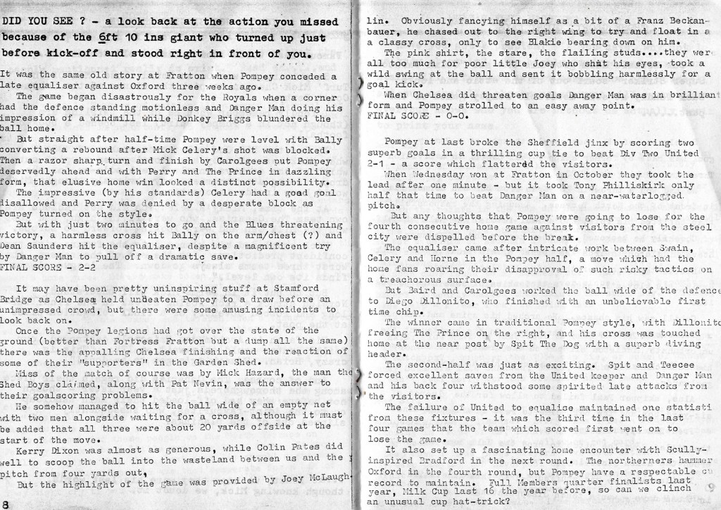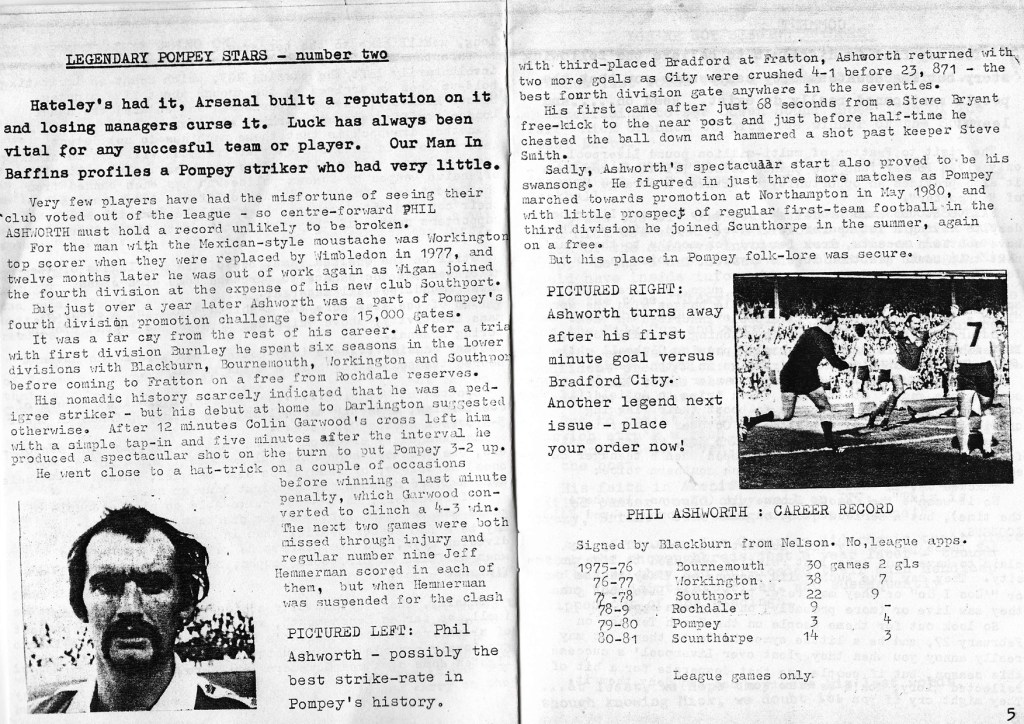 The “Legendary Pompey Stars” piece is brilliant and would become a staple in the copies of the fanzine that I have seen. I know that Aaron Ramsdale has quite a record when it comes to relegations but to be turfed out of the league itself in successive seasons is remarkable. Four goals in three games then shipped off to Scunthorpe seems harsh and all with that ‘tache as well, superb and on display well before the days of netflix and narcos.