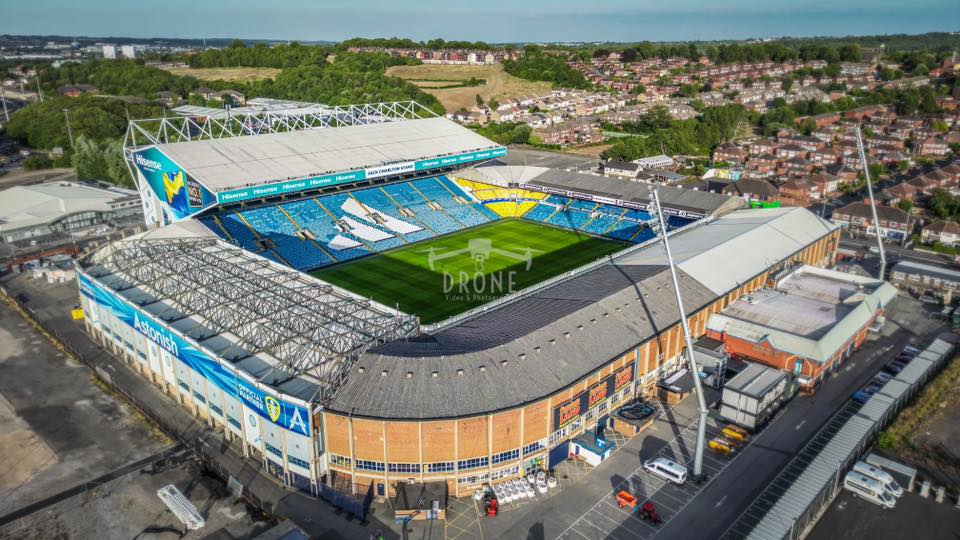 Above is a picture of the old pylons to give you an idea of just how ridiculously tall they were and below is the ground as it is today with the hastily added 2020 bendy floodlights behind the west stand that had to be added to meet Sky TV’s requirements as Leeds returned to the premier league and which will themselves now be removed with the recently approved ground redevelopment.
