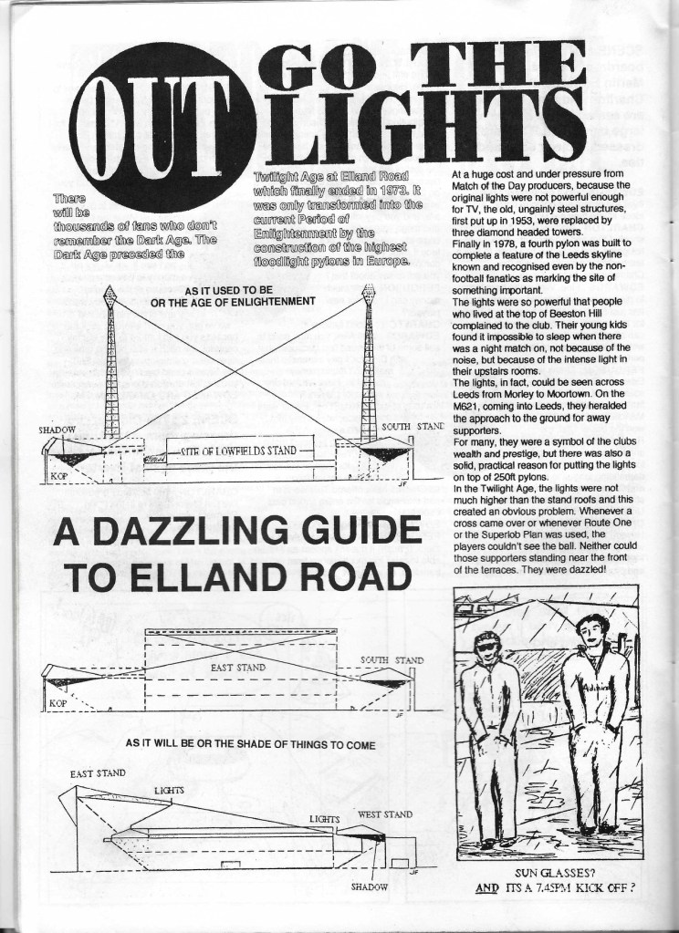 A two page spread in an A4 fanzine (Fear not, they moved to the less ridiculous A5 format some time ago) explains the somewhat haphazard development of floodlights at Elland Road plus the dazzling effect the lights had on the whole city. It is rumoured those near the ground save hundreds of pounds when United were at home though not having to feed the meter. Despite the Beatles connection the movement of shadows from 2 stands to just 1 is to be welcomed as is the tactical advantage over Wimbledon and the boost to whoever came before Sunglasses Hut (I looked it up and they didn’t arrive in the UK to 1994 and so unless I’m badly misreading the TSB numbering system…anyway, you get the point.)