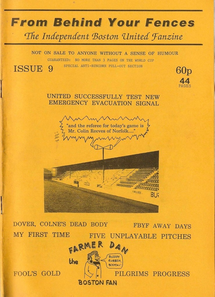 Todays #FanzineoftheDay is issue 9 of From Behind Your Fences (FBYF) coming in at the pocket busting size of 44 pages but the penny pinching price of 60p. Promising no more than 3 pages on the world cup, away day news and Farmer Dan we are back in Spetember 1990. Boston United are in the GMVC (if you know, you know) and would finish the season 18th so I’m relieved that issue 9 comes to us with early season hope still in place and way before the bad old days of Steve Evans.