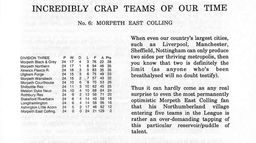 No idea where or how these were sourced but the “Incredibly crap teams of our time” is a great idea. In this case we visit the North East with the remarkable news that Morpeth (Pop 14,393 according to the 1991 census) has FIVE teams in division 3 of a Sunday league. The possibility that there were more than a couple of others in divisions 1, 2, 4, 5 and 6 is a reminder of times when every pub/working men’s club/business had a team (As a teenager I used to ply my trade in Division 8 of the Chesterfield and district Sunday league)