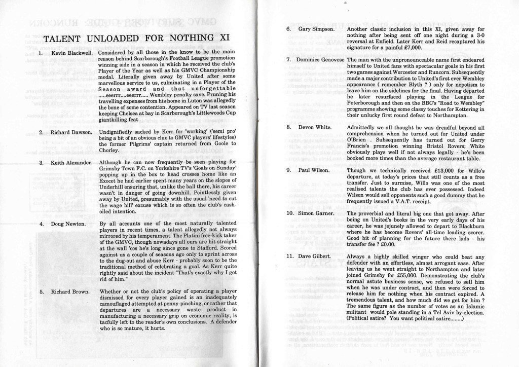 Finally there is a tremendous “Talent unloaded for nothing XI” with some names everyone will recognise. All clubs make mistakes but Kevin Blackwell, Keith Alexander, Devon White and Simon Garner are standouts here. In addition, a “Platini free kick taker”, a £13,000 “free transfer” and returns to Chorley tell the full story of non league transfer policy.