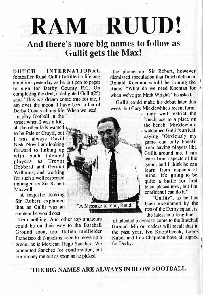 The front and back covers tell the story of Ruud Gullit arriving at Derby County..now the more observant of you will realize that this never happened. The story is a very funny spoof probably based on yet another stupid statement by master of idiocy Robert Maxwell. In 1989 Ruud was part of Saachi’s dominant AC Milan team run by yet another fraudster admittedly but Gary Micklewhite probably never had to worry about his place.