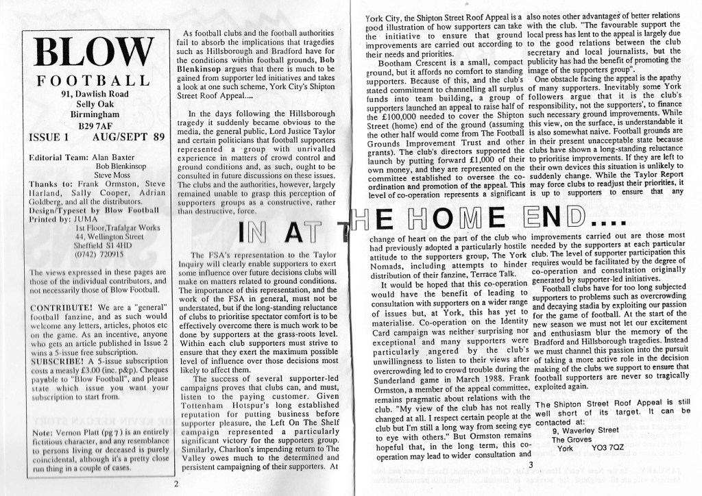 There is no editorial, we get straight into an interesting piece about the implications of the Hillsborough and Bradford disasters, supporter led initiatives and the inability or refusal of the authorities and clubs to recognise this…has anything changed?!